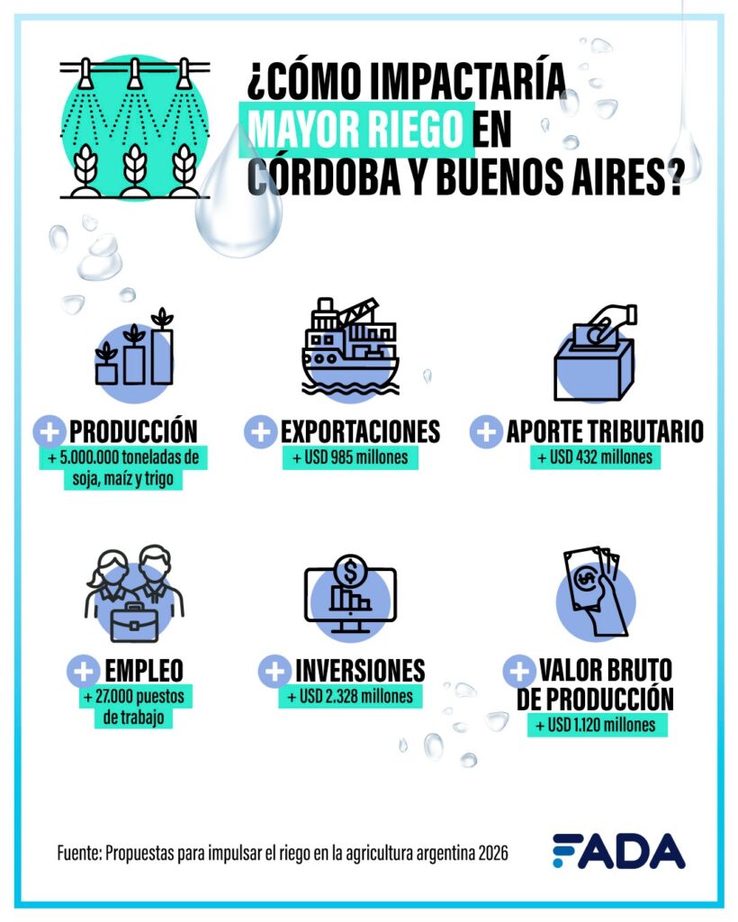 Sólo en Córdoba y Buenos Aires, ampliar el riego generaría más de un millón de toneladas extras de soja, más de 3 millones de maíz y más de 800 mil de trigo, es decir, podrían producirse 5 millones de toneladas más de estos granos. Llevado al empleo, generaría 2 empleos cada 100 hectáreas, aportando más de 27 mil puestos de trabajo: en servicios, industrias, fletes, para las exportaciones, entre muchos otros. “En ciertas zonas de Argentina, el riego no sólo mejora los rindes, o sea, lo que podés producir por hectárea, sino que marca la diferencia entre poder o no sembrar”, resaltan desde FADA.