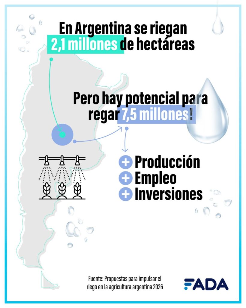 El mundo demanda cada vez más alimentos y producir enfrentando las constantes sequías es un gran desafío. En Argentina se riegan 2,1 millones de hectáreas, pero hay potencial para regar 7 millones y medio. Un estudio de FADA (Fundación Agropecuaria para el Desarrollo de Argentina) encontró un potencial oculto en la ampliación y mejoramiento del riego. En el informe se trabajaron propuestas que revelaron al riego como un generador de más empleo, más producción y un aliado de la sustentabilidad.