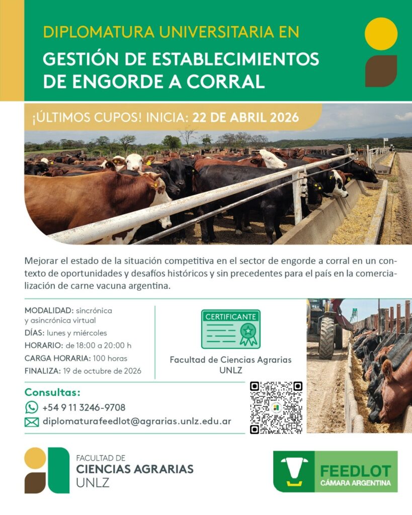 La cursada tendrá una carga horaria total de 100 horas y se desarrollará en modalidad virtual —sincrónica y asincrónica— los lunes y miércoles de 18 a 20 horas. El inicio está previsto para el 22 de abril de 2026 y la finalización para el 19 de octubre del mismo año. Además, incluye una visita técnica a campo a un establecimiento de engorde a corral. Formación estratégica para un negocio cada vez más profesionalizado