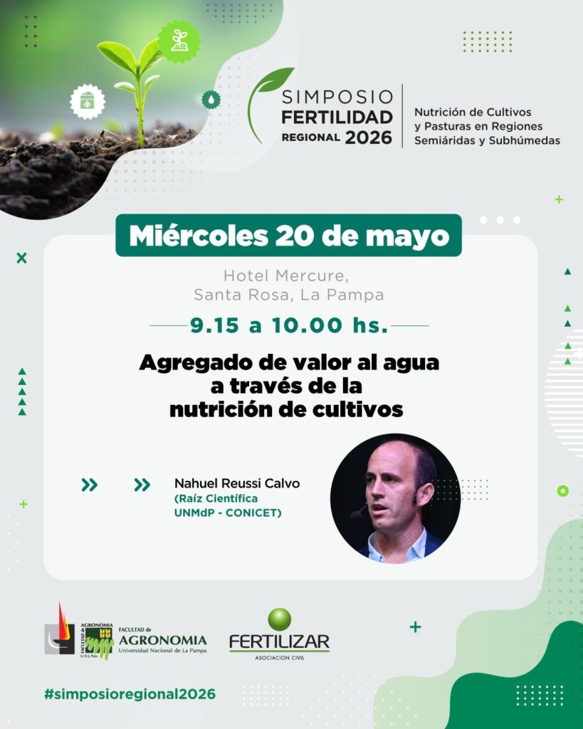 La apertura técnica estará a cargo del Dr. Nahuel Reussi Calvo (Raíz Científica – UNMP – CONICET), quien desarrollará la conferencia “Agregado de valor al agua a través de la nutrición de cultivos”. Durante su exposición, abordará cómo una adecuada estrategia nutricional puede mejorar la eficiencia en el uso del agua en regiones donde este recurso es limitante, generando impactos directos en los rendimientos y en la sostenibilidad de los sistemas productivos.