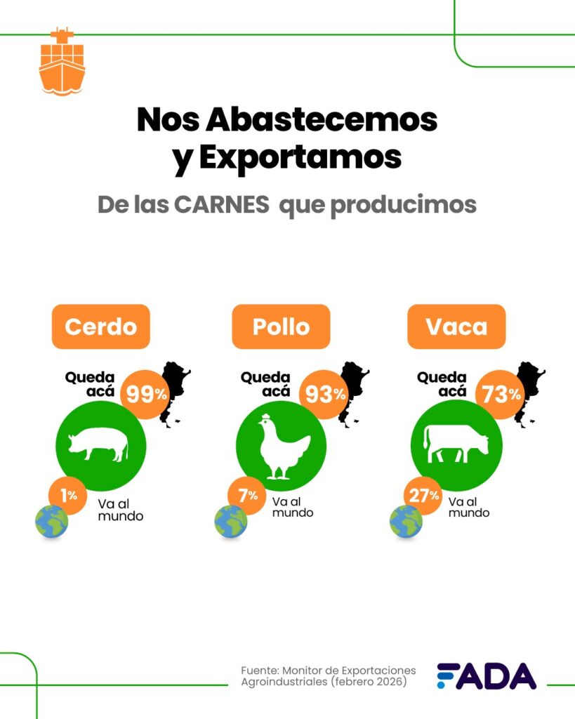 El complejo de la carne de vaca creció un 25% respecto al año anterior y es la tercera cadena generadora de dólares. “Si nos detenemos en las carnes, podemos ver que del total que producimos de vaca, el 73% es para nuestro consumo y el 27% lo exportamos. En el cerdo el 99% queda en Argentina y en el pollo el 93%”, comentan desde FADA.