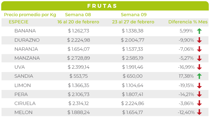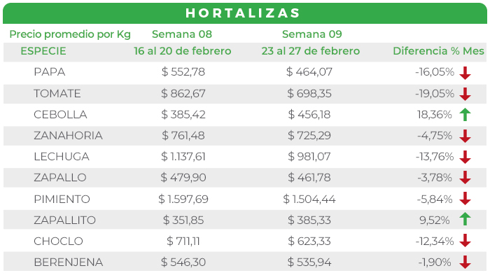 El presente reporte detalla la evolución de los precios promedio registrados en las semanas 8 y 9 del año para las principales especies frutihortícolas comercializadas en el Mercado Central de Buenos Aires