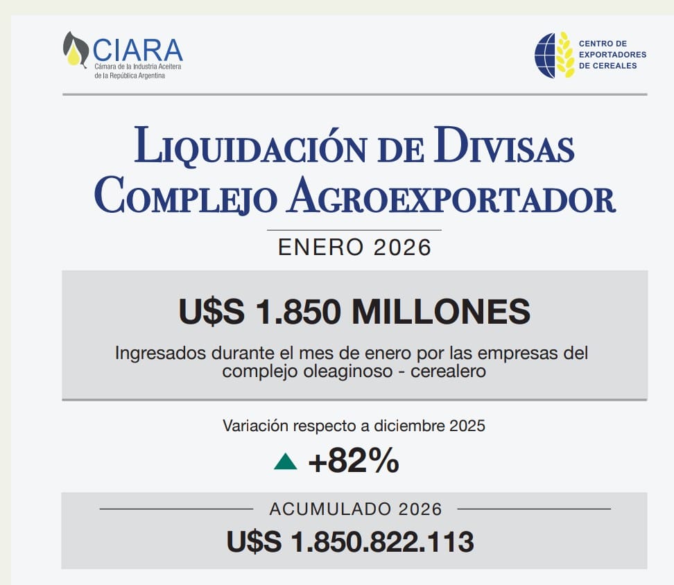La Cámara de la Industria Aceitera de la República Argentina (CIARA) y el Centro de Exportadores de Cereales (CEC), entidades que representan el 48 % de las exportaciones argentinas, anunciaron hoy que durante el mes de enero las empresas del sector liquidaron la suma de U$S 1.850 millones de dólares; implicando un 82% mayor en relación al mes de diciembre de 2025