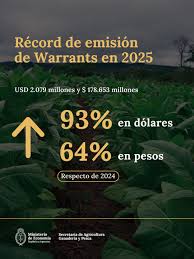 La Secretaría de Agricultura, Ganadería y Pesca del Ministerio de Economía de la Nación informa que, según datos de la Subsecretaría de Mercados Agroalimentarios e Inserción Internacional, durante el año pasado se emitieron warrants por 2.079 millones en dólares y 178.653 millones en pesos, alcanzando un récord en ambas monedas que superó los registros de 2024 en 93% y en 64%, respectivamente.