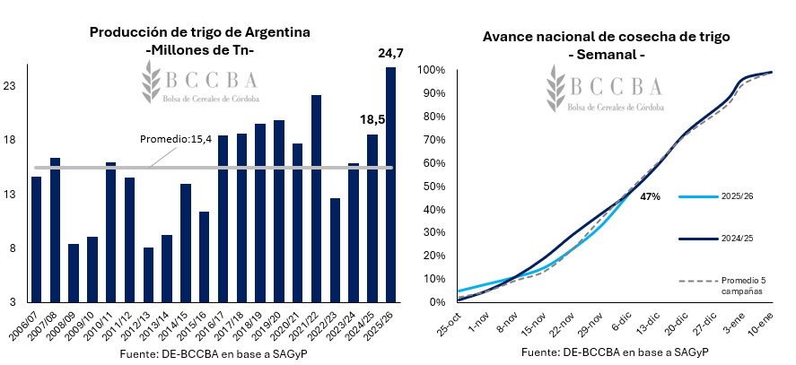 Durante las últimas cuatro campañas la producción nacional de trigo a nivel nacional ha exhibido un crecimiento sostenido. Para el corriente ciclo 25/26, se mantendría dicha tendencia, estimando un récord productivo de 24,7 millones de toneladas, 33% por encima de lo obtenido en la campaña pasada y 9 millones de toneladas por encima del promedio, según los datos brindados por la Secretaría de Agricultura, Ganadería y Pesca de la nación. Otras estimaciones, como la de la Bolsa de Cereales de Buenos Aires, son más optimistas y estiman una cosecha de 25,5 millones de toneladas. Con respecto a las labores de cosecha, se encuentran desarrollándose en torno a niveles promedio, para los primeros días de diciembre ya se habría trillado el 47% de la cosecha.