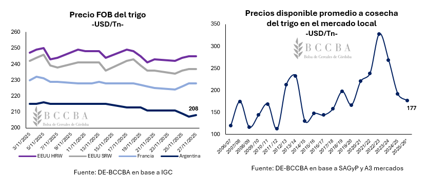 En el plano de las cotizaciones, esta abundancia del trigo se vería reflejado en los distintos mercados. En el plano local, el precio para diciembre de 2025 se estima en USD 177 por tonelada, USD 15 por debajo del diciembre de 2024, continuando con la tendencia bajista de los últimos ciclos y ubicándose como el precio más bajo a cosecha de los últimos 5 años. Por el lado de los precios internacionales (FOB), Argentina presenta la menor cotización en comparación a Estados Unidos y Francia, comercializándose a USD 208/Tn a fines de noviembre. Dicha posición coloca al trigo argentino en un plano más competitivo, permitiendo compensar el elevado costo de flete que debe hacerse frente para colocar la producción local en los distintos destinos y las diferencias en la calidad frente al resto de los competidores.