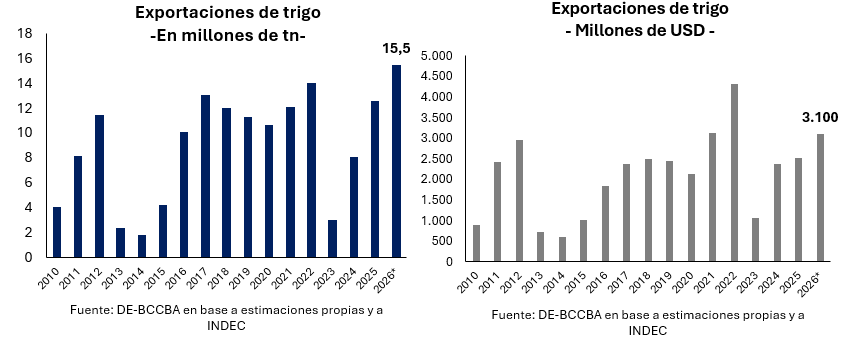 Las exportaciones de trigo argentino estimadas para el 2026 se posicionarían en 15,5 millones de toneladas, el volumen más alto registrado. Lo cual, se reflejaría en un ingreso de divisas de USD 3.100 millones, posicionándose USD 1.000 millones por encima del promedio anual de divisas, aun así, no se lograría alcanzar ingresos históricos dada las menores cotizaciones de los distintos mercados.