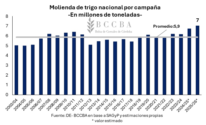 La molienda nacional de trigo muestra una sostenida estabilidad entre campañas, con un promedio cercano a 5,9 millones de toneladas anuales. Sin embargo, en los tres últimos ciclos se presenta una tendencia al alza, impulsada en principio por una mayor disponibilidad de grano para la industria. Para la campaña 2025/26, la molienda proyectada alcanzaría un récord de 7 millones de toneladas molidas.