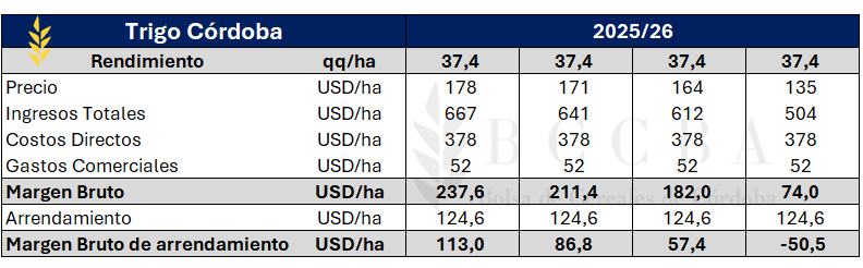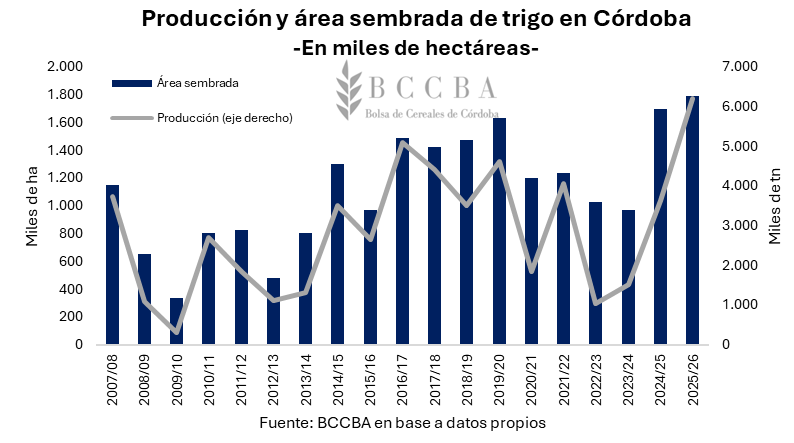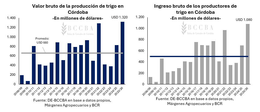 En línea con la tendencia nacional, la provincia de Córdoba alcanzaría un volumen de 6,2 millones de toneladas y un rendimiento récord de 37,4 qq/ha. El Valor Bruto de la Producción (VBP) del cereal cordobés se ubicaría en los máximos registrados con USD 1.320 millones, impulsado por una inversión de aproximadamente USD 500 millones por parte de los productores.