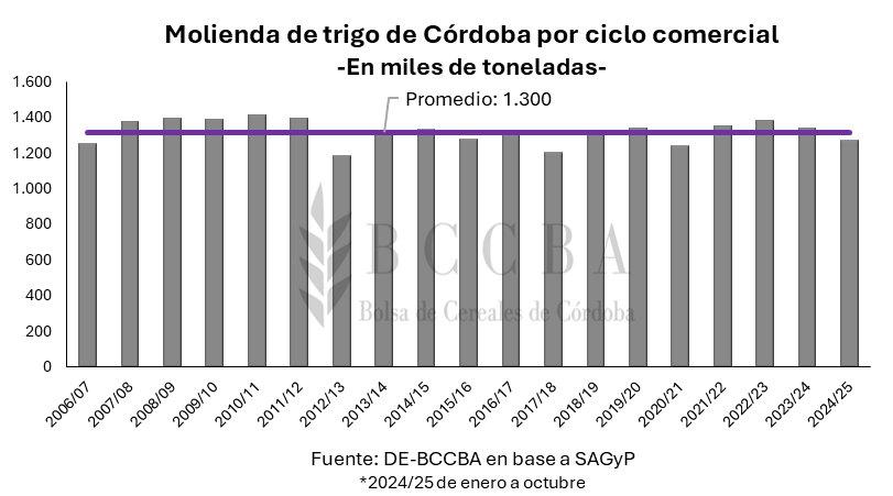En relación con la industrialización del cereal, Córdoba transforma, en promedio, 1,3 millones de toneladas de trigo por ciclo. Históricamente, la provincia cosecha un volumen superior de trigo del que industrializa, llegando a producir hasta cinco veces por encima a lo que se procesa en una campaña. De cara a la campaña 2025/26, el volumen de molienda promedio se vería más que compensado por la producción esperada. Y, en cuanto a la industrialización de la campaña 2024/25, ya casi se ha cubierto el volumen de molienda estimado (1,2 millones) en los meses de enero a octubre, ubicándose a tan solo 100 mil toneladas por debajo del promedio (cuando faltan dos meses por cerra el año comercial).