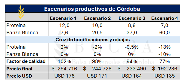 Un factor que afecta el precio del cereal es el nivel de proteína del grano, el cual, suele variar entre campañas debido a las distintas condiciones climáticas y a la disponibilidad de nitrógeno en los suelos. En una campaña como la actual, con lluvias por encima de lo normal y donde los rendimientos serían récords, si ese mayor potencial productivo no fue acompañado por la nutrición necesaria para sostener la calidad, los niveles de proteína podrían verse afectados. Una menor proteína implica una merma en la calidad de masas, volviéndolas más débiles y menos elásticas (menos gluten), lo que puede afectar la elaboración de panes. Además, si el destino es forrajero, puede generar problemas de digestibilidad para el ganado.
