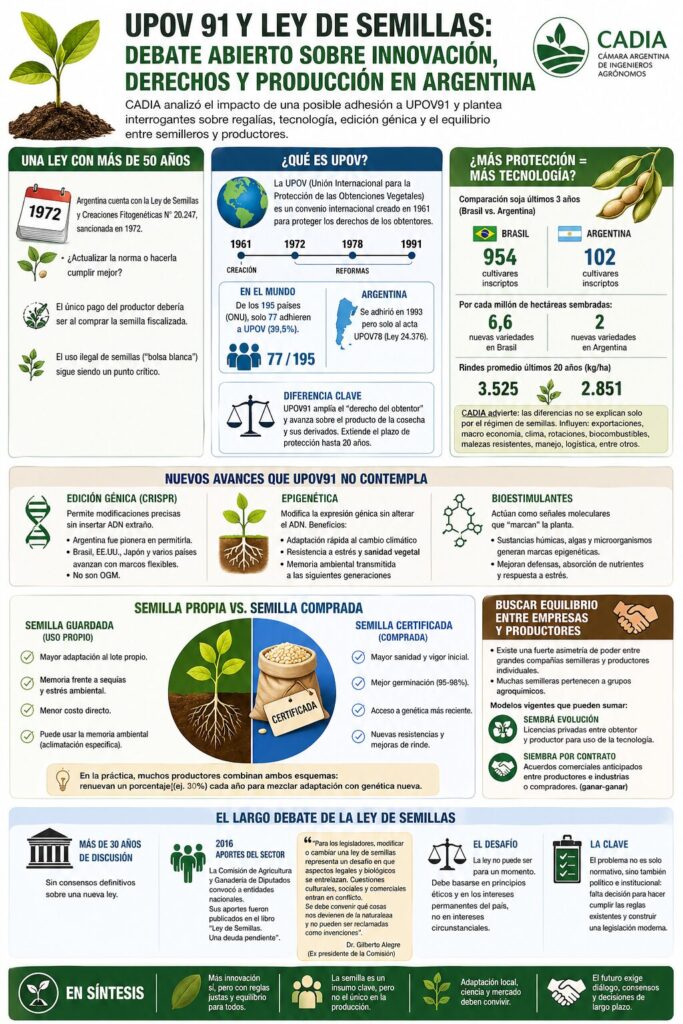 La discusión por la propiedad intelectual en semillas volvió a instalarse con fuerza en la agenda agropecuaria argentina luego de las referencias incluidas en el reciente Acuerdo de Comercio e Inversión entre Estados Unidos y Argentina. En ese contexto, la Cámara Argentina de Ingenieros Agrónomos (CADIA) difundió un extenso informe en el que analiza la eventual adhesión del país al convenio internacional UPOV91 y sus implicancias para el sector productivo.